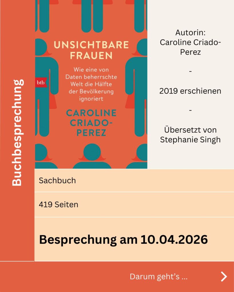 Am 10.04. wollen wir uns im Buchclub zu diesem wichtigen Sachbuch austauschen und gemeinsam über die dargestellten Daten sprechen. Bestenfalls konnten alle Teilnehmenden bis dahin das Buch bereits durchlesen, doch das ist keine zwingende Voraussetzung. Wer an der Besprechung teilnehmen möchte, kann ohne Anmeldung um 19 Uhr ins Tataa kommen und sich zu uns gesellen.