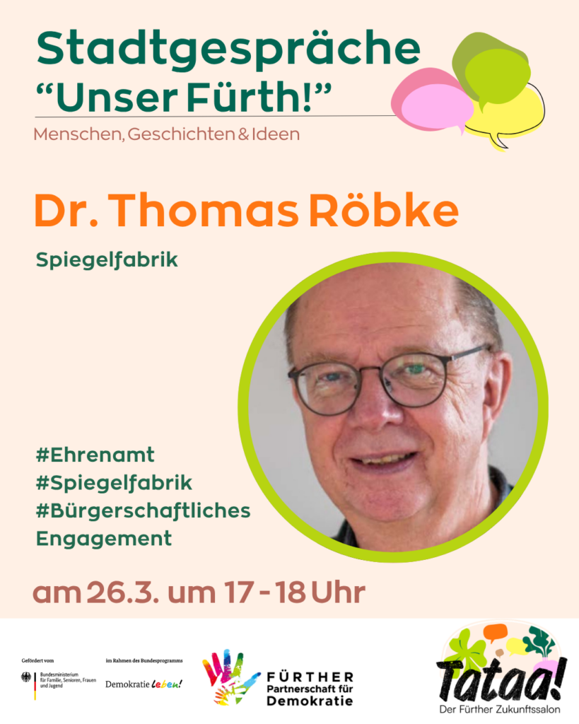 Thomas Röbke ist ein rundum überzeugter Ehrenamtler. Ob als Mitgründer des Zentrums Aktiver Bürger (ZAB) in Nürnberg oder des Freiwilligenzentrums hier in Fürth – das bürgerschaftliche Engagement ist der rote Faden in seinem Leben.