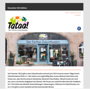 Für alle, die automatisch auf dem Laufenden bleiben wollen, haben wir eine Newsletterfunktion. Ihr könnt diesen unter https://www.zukunftssalon-fuerth.de/newsletter/ abonnieren. Einmal im Monat schicken wir Infos