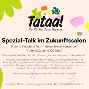 Den Wandel leben im Tataa! Der Fürther Zukunftssalon am Marktplatz 4 (Grüner Markt) Am 20. Juli wird Bluepingu Fürth erwachsen – und das schon nach