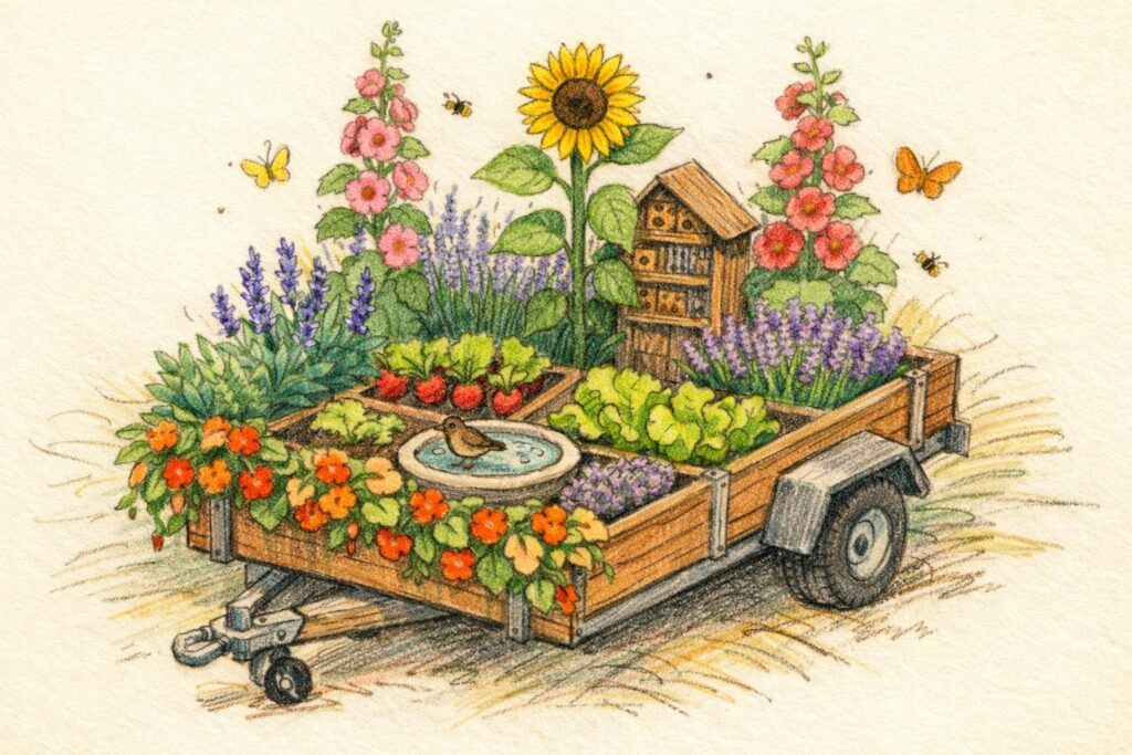 Wir, Sebastian und Thomas vom Stadtplanungscafe, kaufen einen kleinen PKW-Anhänger und widmen ihn der Biodiversität und den Menschen. Bis zu 14 Tage steht er an Stellen, die sonst parkenden Autos vorbehalten sind und bringt Leben in die Stadt – voraussichtlich Innen- und Südstadt. Auf der Ladefläche tummeln sich zwischen unterschiedlichen Pflanzen Wildbienen, Käfer und Schmetterlinge. Singvögel nehmen ein Bad in der Wassertränke. Wer sich in dieser beruhigenden Atmosphäre eine kleine Auszeit nehmen möchte, nimmt an der Seite des Anhängers auf einer kleinen Sitzbank Platz und genießt den Blick ins Grüne …
